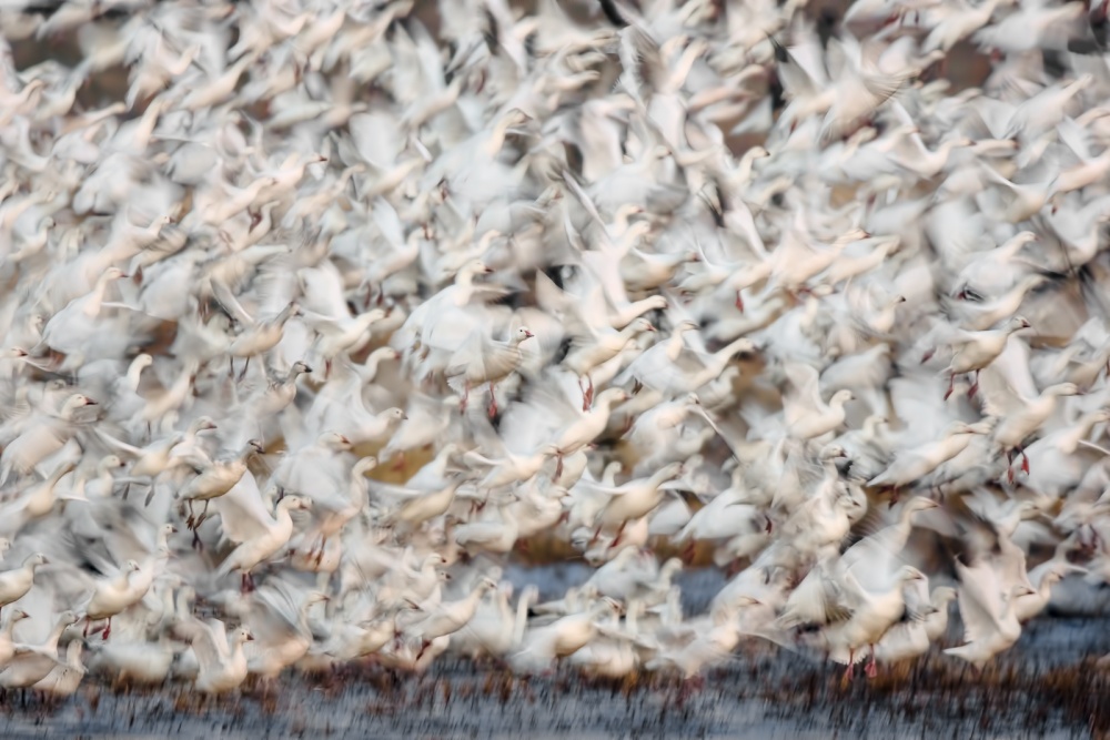 It was a chilly winter morning in New Mexico when I was photographing cranes and snow geese. The cranes had rested over a swamp area during the night. Light fog hovered over the water at dawn when the sun turned it into a steamy golden pond. I was immersed in the dreamy mood and asked myself - how do I enhance the dream? I envisioned an image in which birds fly over the water and they were blurry as if they were flying in a dream... My experience told me that the cranes would take off soon after the sunrise and they would take off in a direction that was against the wind. So I aimed the camera to the area in the predicted flight path of the cranes, set the manual focus at the distance I predicted, locked down the camera on the tripod, and used ISO200, F16, 1/6 second shutter speed. I have photographed cranes with slow shutter speed in many occasions. I knew that the cranes would appear blurry whilst still maintaining some detail at this speed. This was almost a typical technique I would use for landscape work, except I set the camera at a high-speed continuous shooting mode.