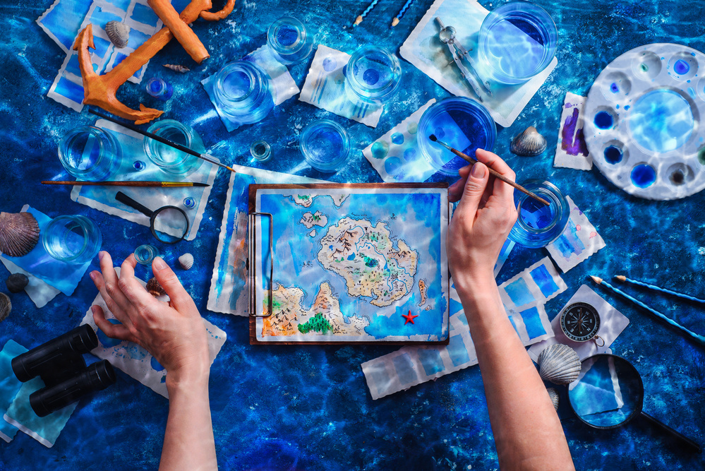 Speaking of which. I don't really believe in abstract inspiration. I believe in the inspiration that finds us during our work. So, I just sit down with my sketchbook, felt pens and a cup of tea and start to think: about what the next picture could be? I can choose an abstract topic (e.g. sea, astronomy, travel, sweets), and find suitable objects to this story. Or, on the contrary, I can select an object (e.g. recently bought cups, magnifying glass or shell) and come up with a little adventure for it.